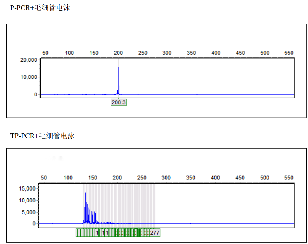 熒光毛細管電泳檢測:熒光標記毛細管電泳采用不同顏色的熒光染料標記引物,擴增的PCR產(chǎn)物在毛細管泳道電泳,利用軟件進行圖像收集和分析擴增片段大小。對于重復次數(shù)不超過100次的疾病,可以通過普通PCR擴增,結(jié)合凝膠電泳或毛細管電泳進行檢測。